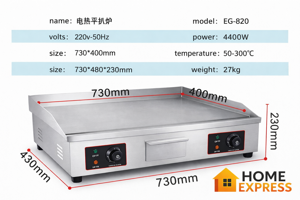 This professional-grade commercial electric griddle is designed for restaurant, café, and food stall use. Ideal for cooking eggs, pancakes, meat, hamburgers, and more, it delivers powerful performance, even heat distribution, and reliable temperature control for high-efficiency cooking.